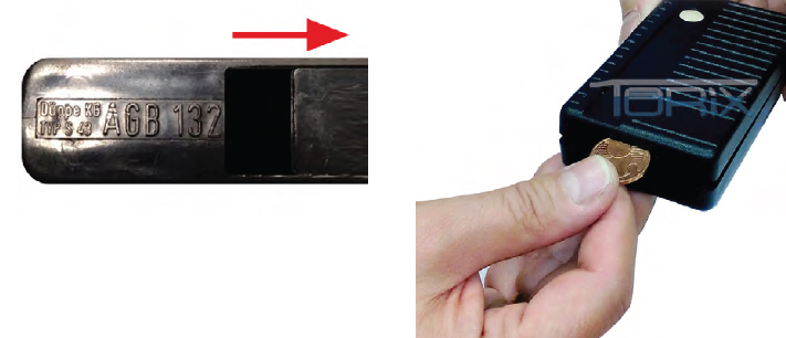 Öffnen Sie das Batteriefach, entweder durch verschieben des Deckels (Bild 1) oder mit einer Münze (Bild 2).